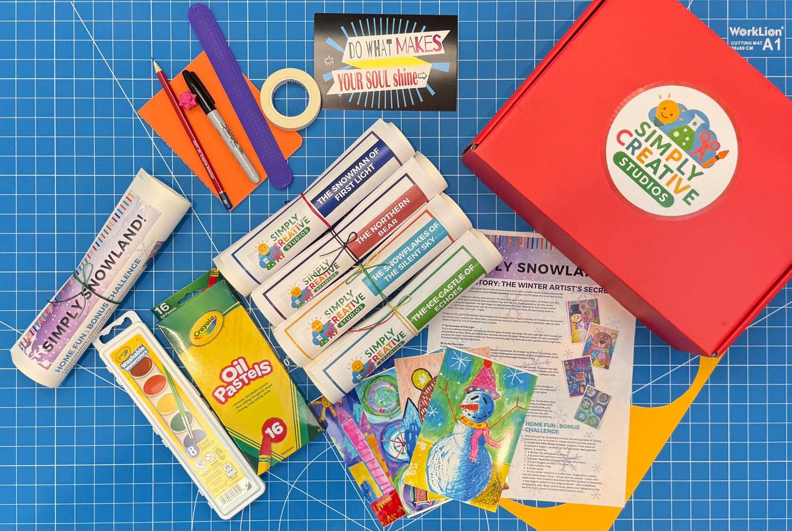 A beautifully curated winter art kit featuring four guided watercolor projects, premium materials, and a bonus creative challenge. With step-by-step inspiration cards and high-quality art tools, this kit gives your child everything they need to explore color, build real art skills, and bring the magical world of Simply Snowland to life.